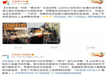 The Communist Youth League Central Committee forwarded CCTV"s video, "China"s First Gold! Post-95s ‘Chinese Welding King’ Conquered the World"