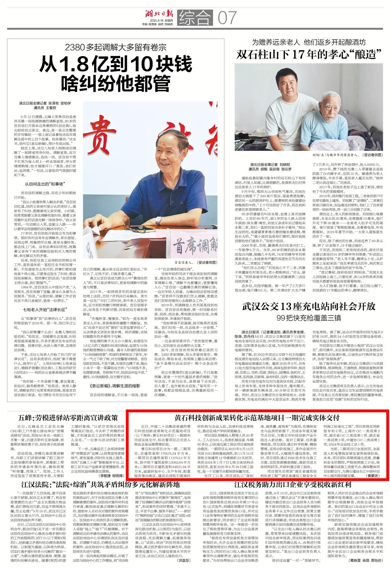 9月20日,《湖北日報》及湖北電視臺以黃石科創示范基地一期竣工交付為主題,對上海二十冶黃石科創項目進行了專題報道。