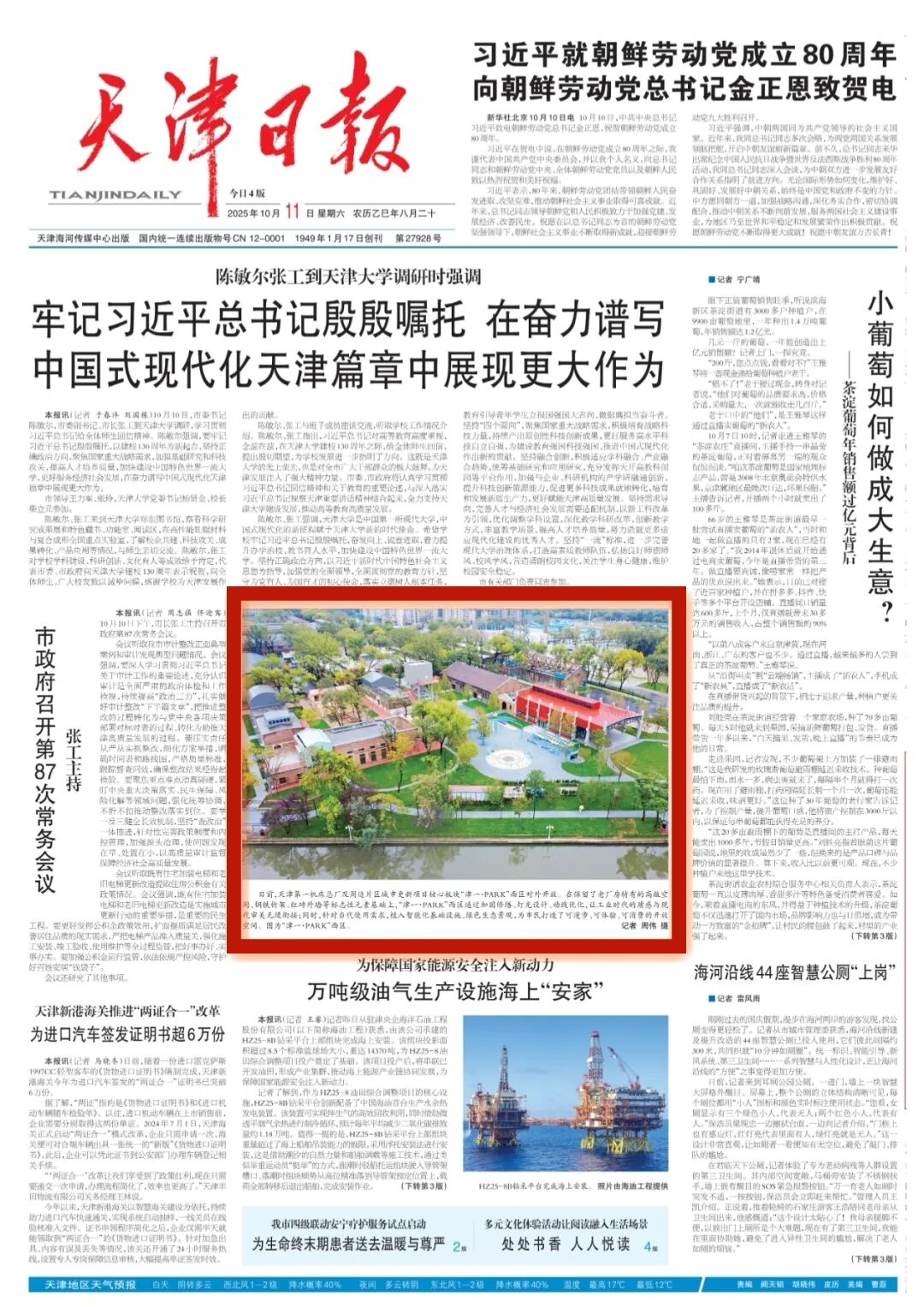 10月11日,《天津日報》頭版以圖片新聞形式報道天津二十冶承建的第一機床總廠城市更新項目津一·PARK西區(qū)對外開放。