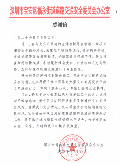 12月1日,深圳二十冶空港二期項目收到深圳市寶安區福海街道道路交通安全委員會辦公室感謝信。